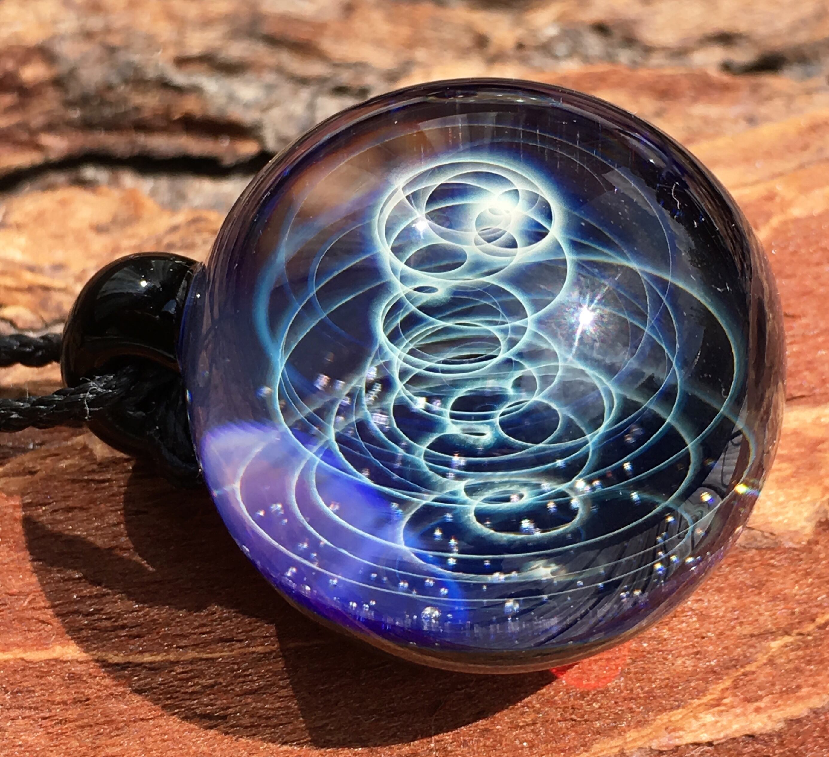 神秘的な立体の模様が特徴の耐熱性ガラスのハンドメイドペンダントです。