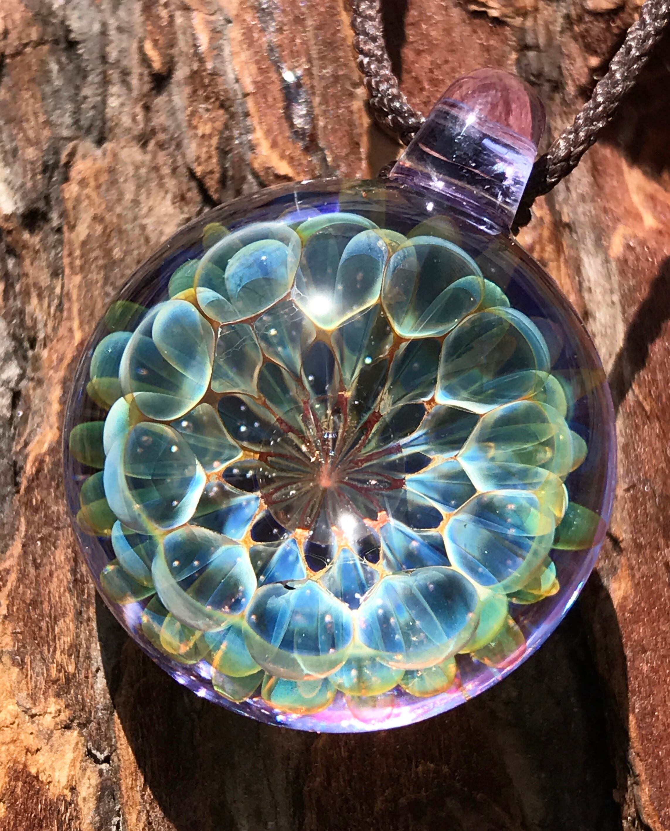 酸素を使用した酸素バーナーを使用して2000度の温度で耐熱ガラスを溶かし、ハンドメイドで製作された一つだけのガラスペンダントです。
