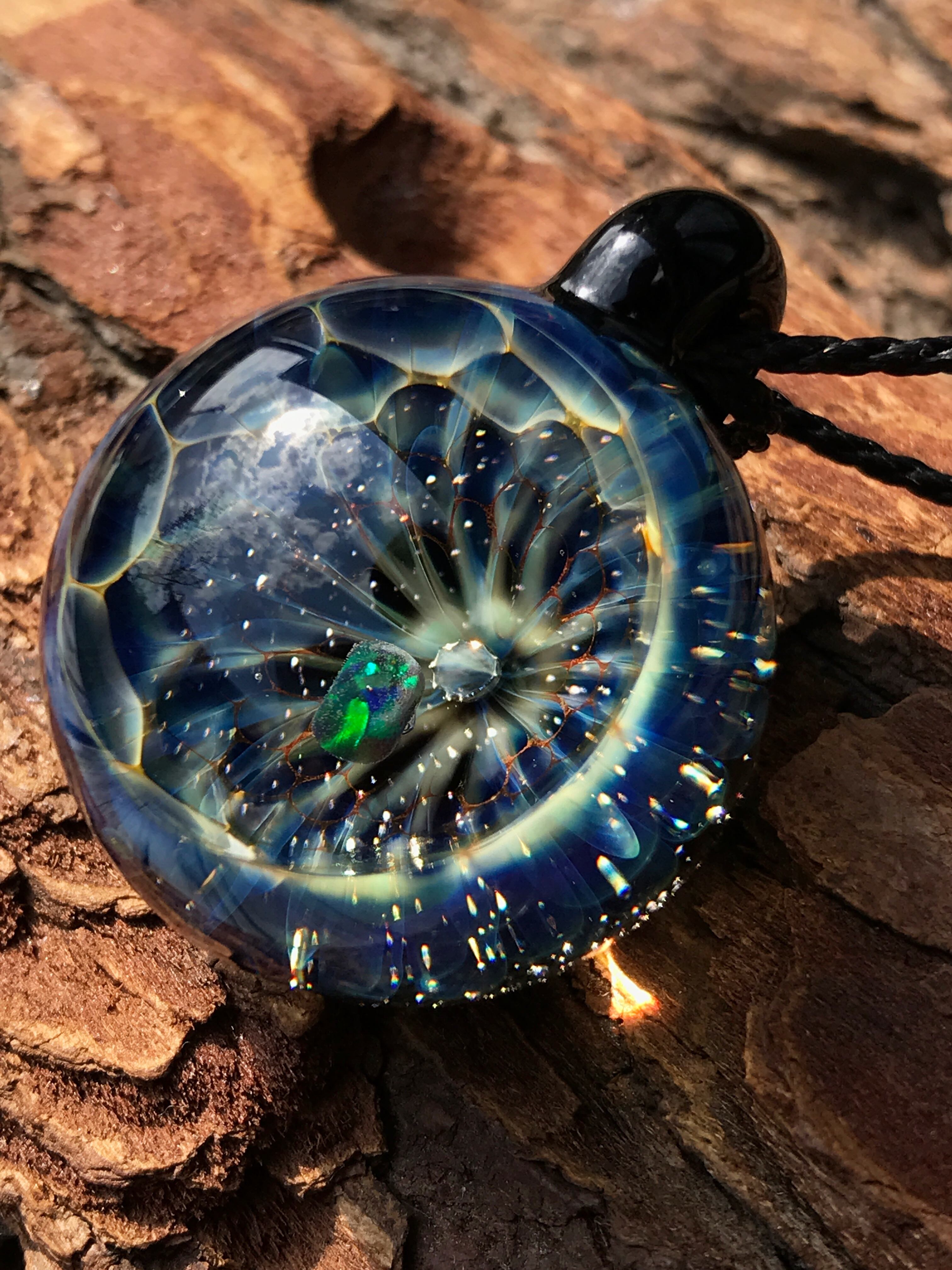 明るい光に照らすとオパールと立体の模様が輝くガラスペンダントです。