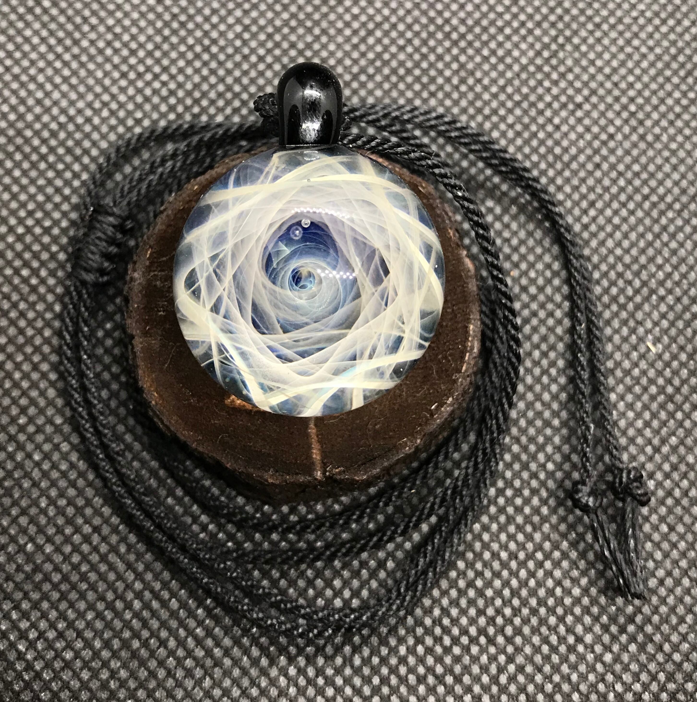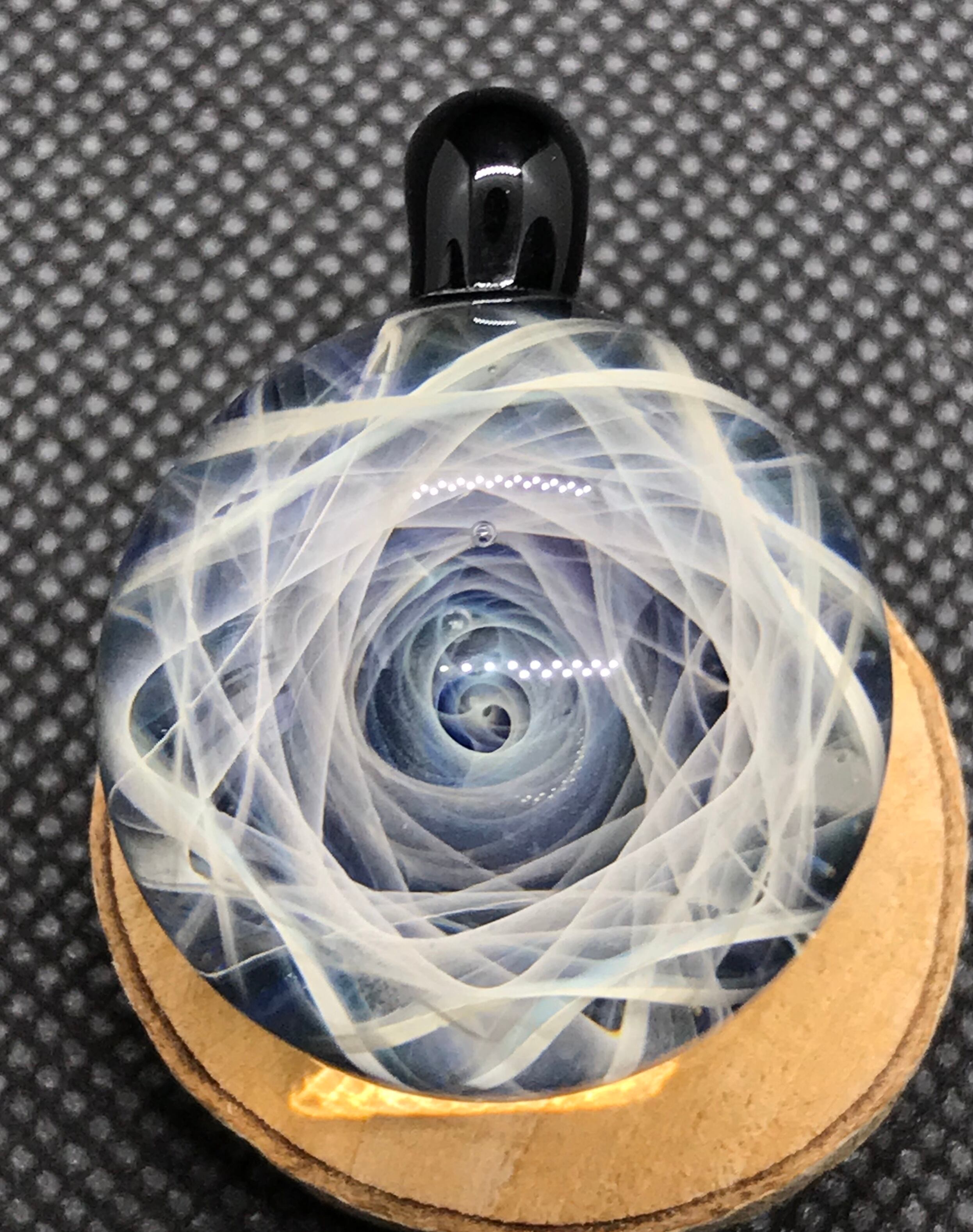酸素バーナーを使用して2000度以上の温度で耐熱ガラスを溶かし、ハンドメイドで製作された一つだけのガラスペンダントです。