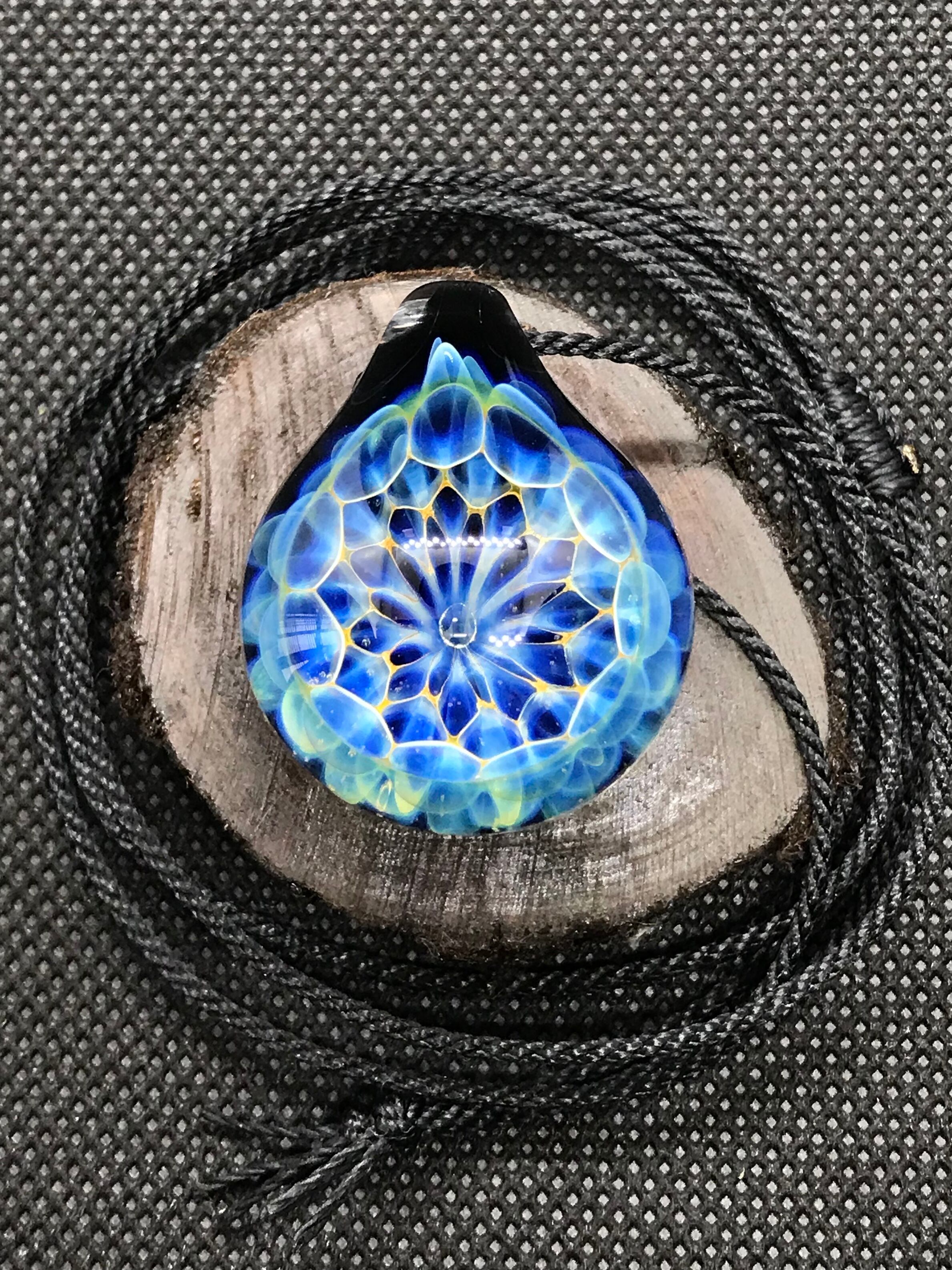 酸素を使用した酸素バーナーを使用して2000度の温度で耐熱ガラスを溶かし、ハンドメイドで製作された一つだけのガラスペンダントです。