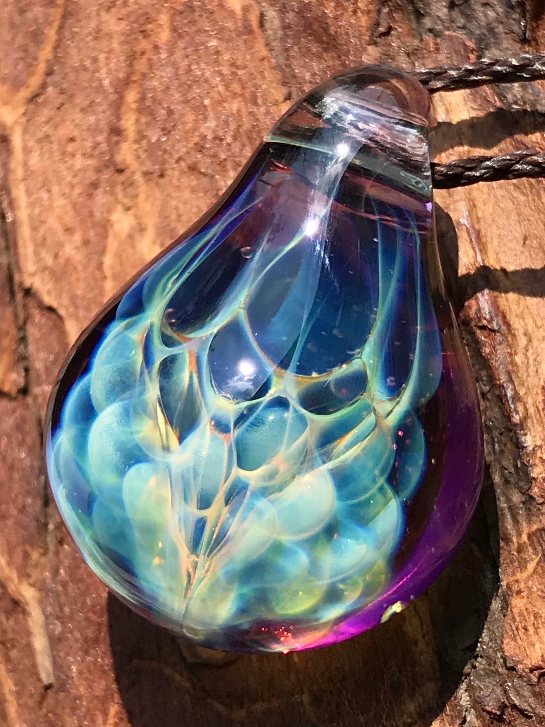酸素を使用した酸素バーナーを使用して2000度の温度で耐熱ガラスを溶かし、ハンドメイドで製作された一つだけのガラスペンダントです。