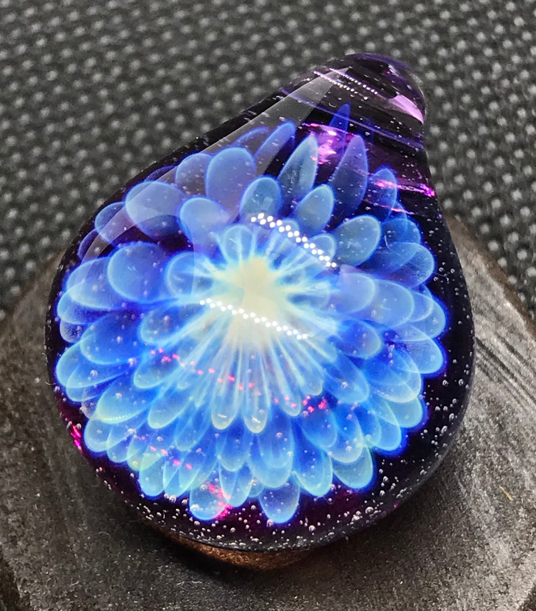 酸素を使用した酸素バーナーを使用して2000度の温度で耐熱ガラスを溶かし、ハンドメイドで製作された一つだけのガラスペンダントです。