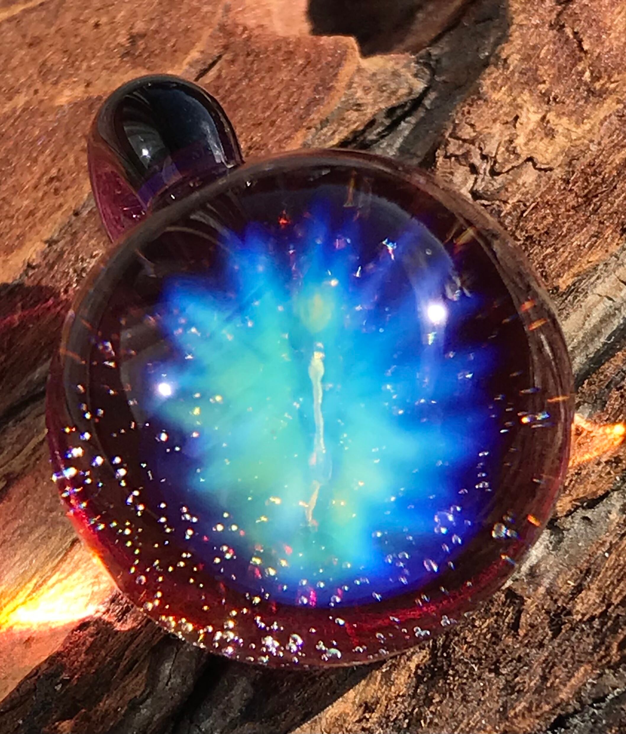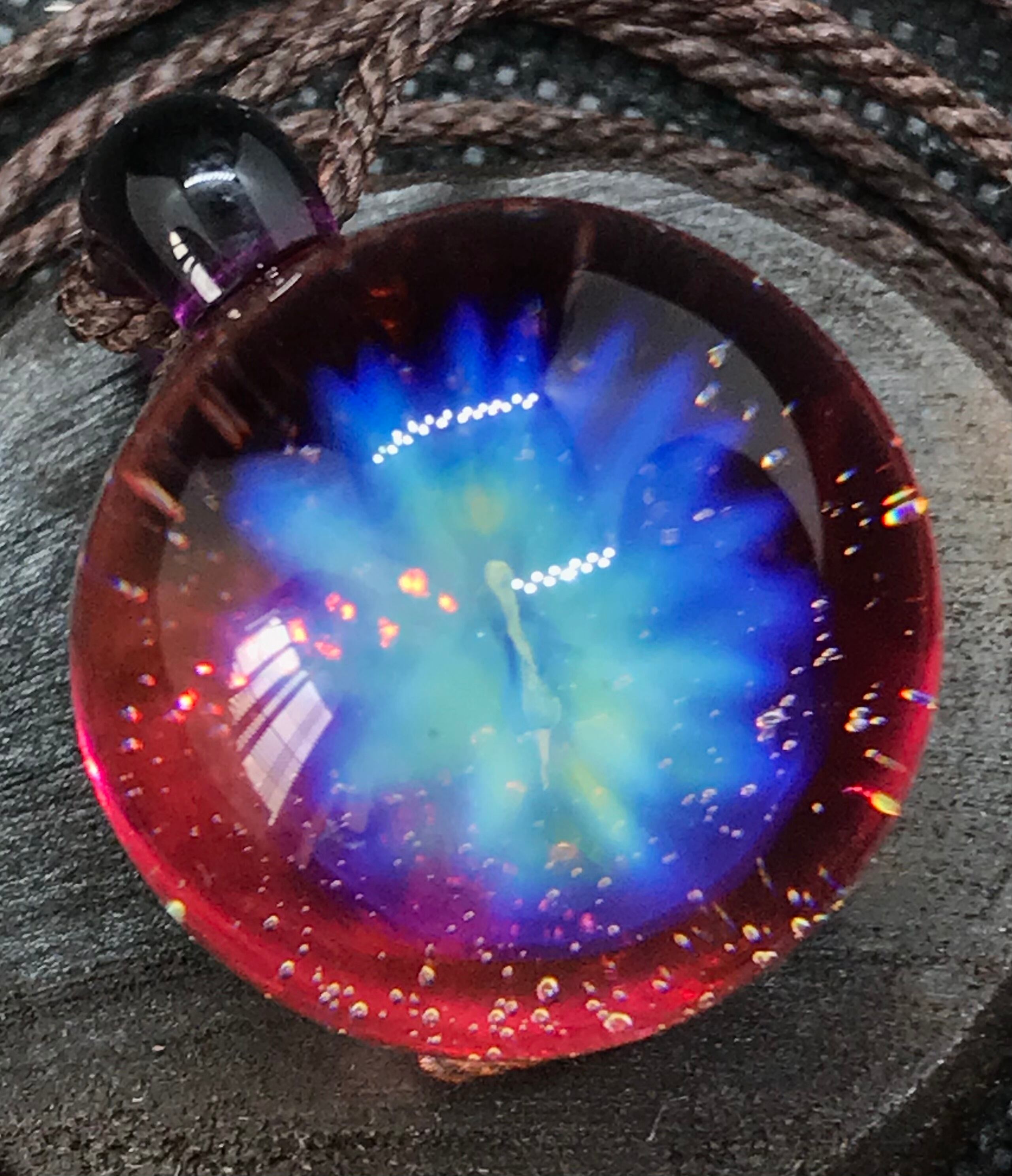 酸素を使用した酸素バーナーで2000度の温度で耐熱ガラスを溶かし、手作業で製作された一つだけのガラスペンダントです。
