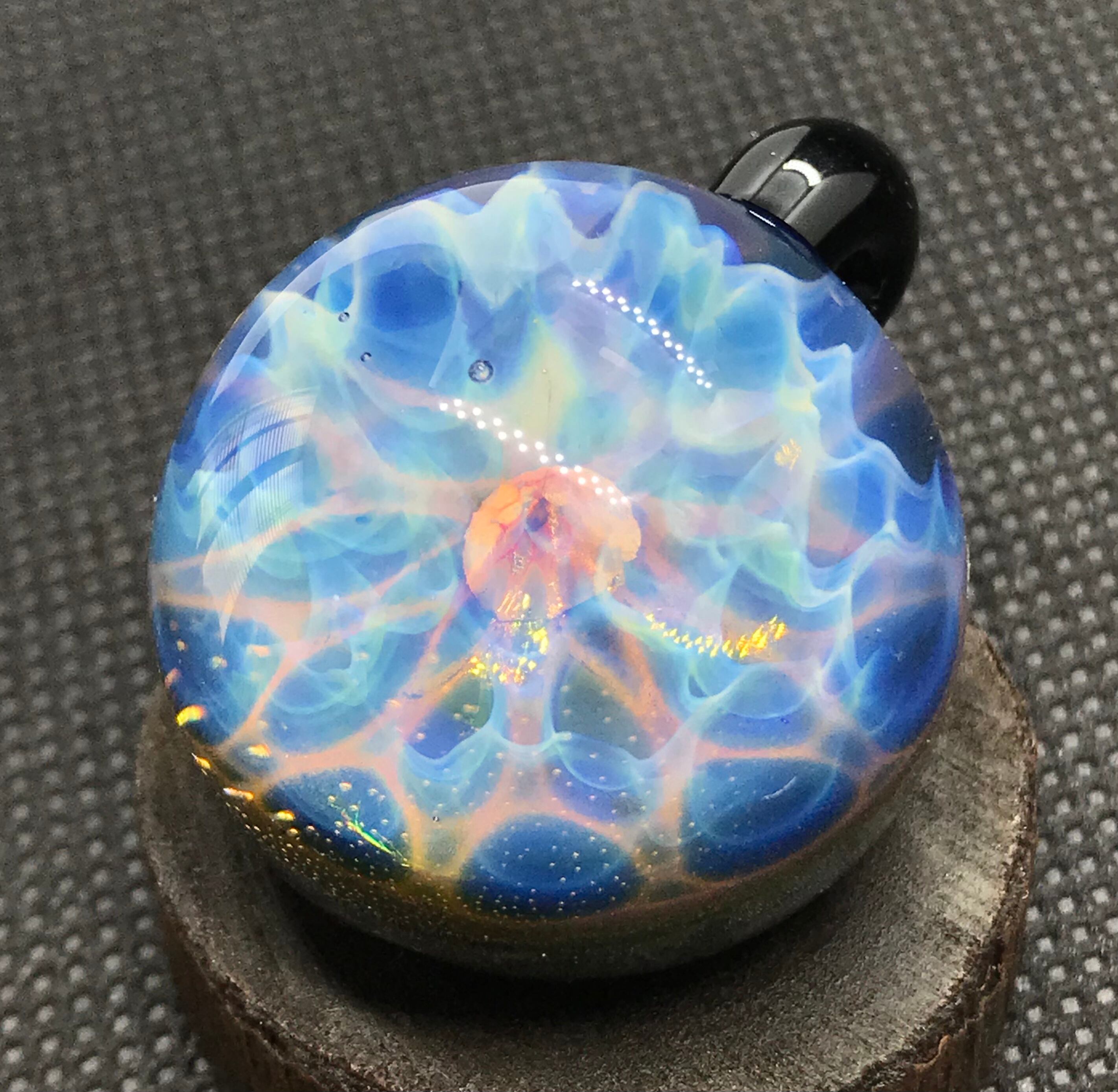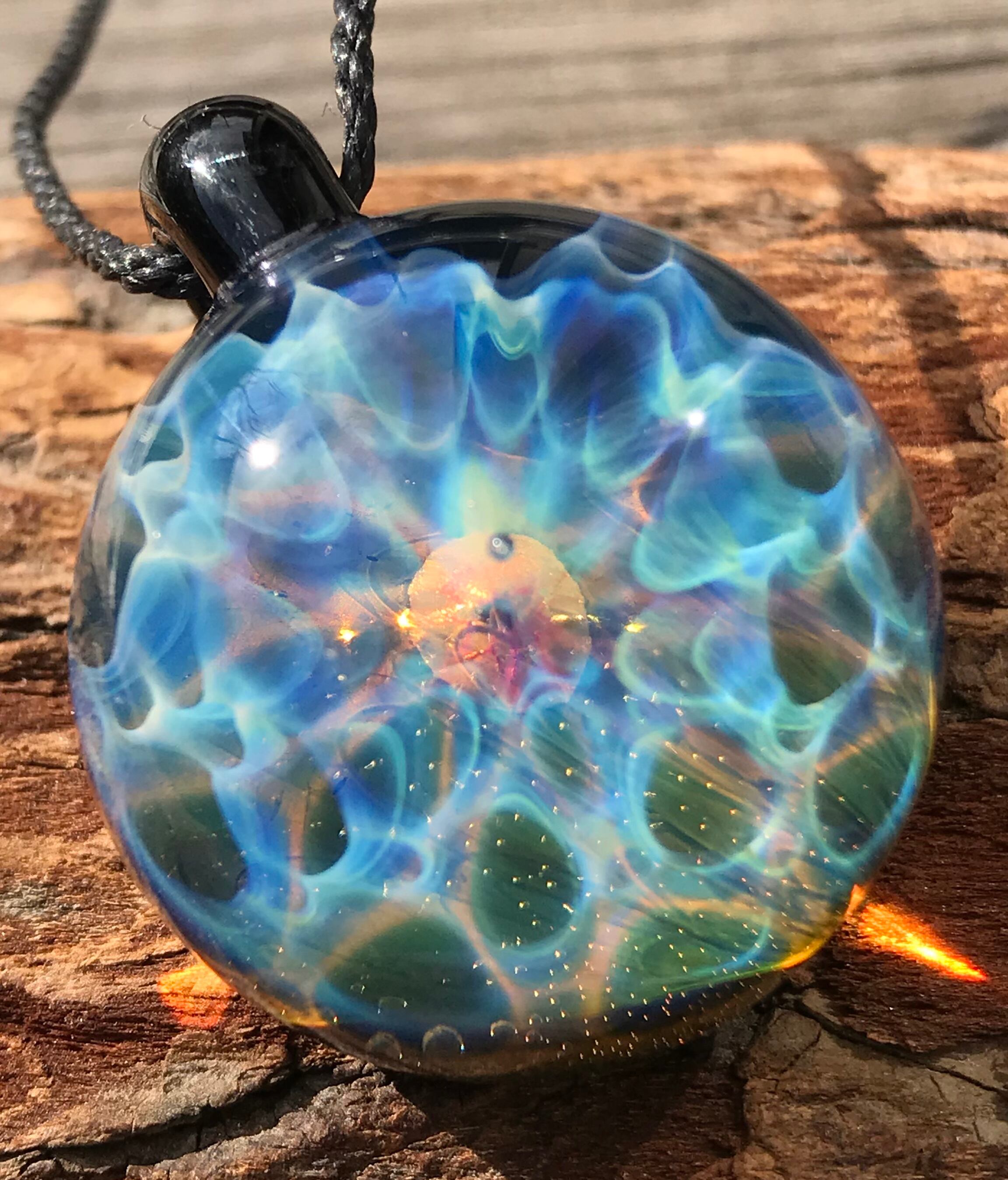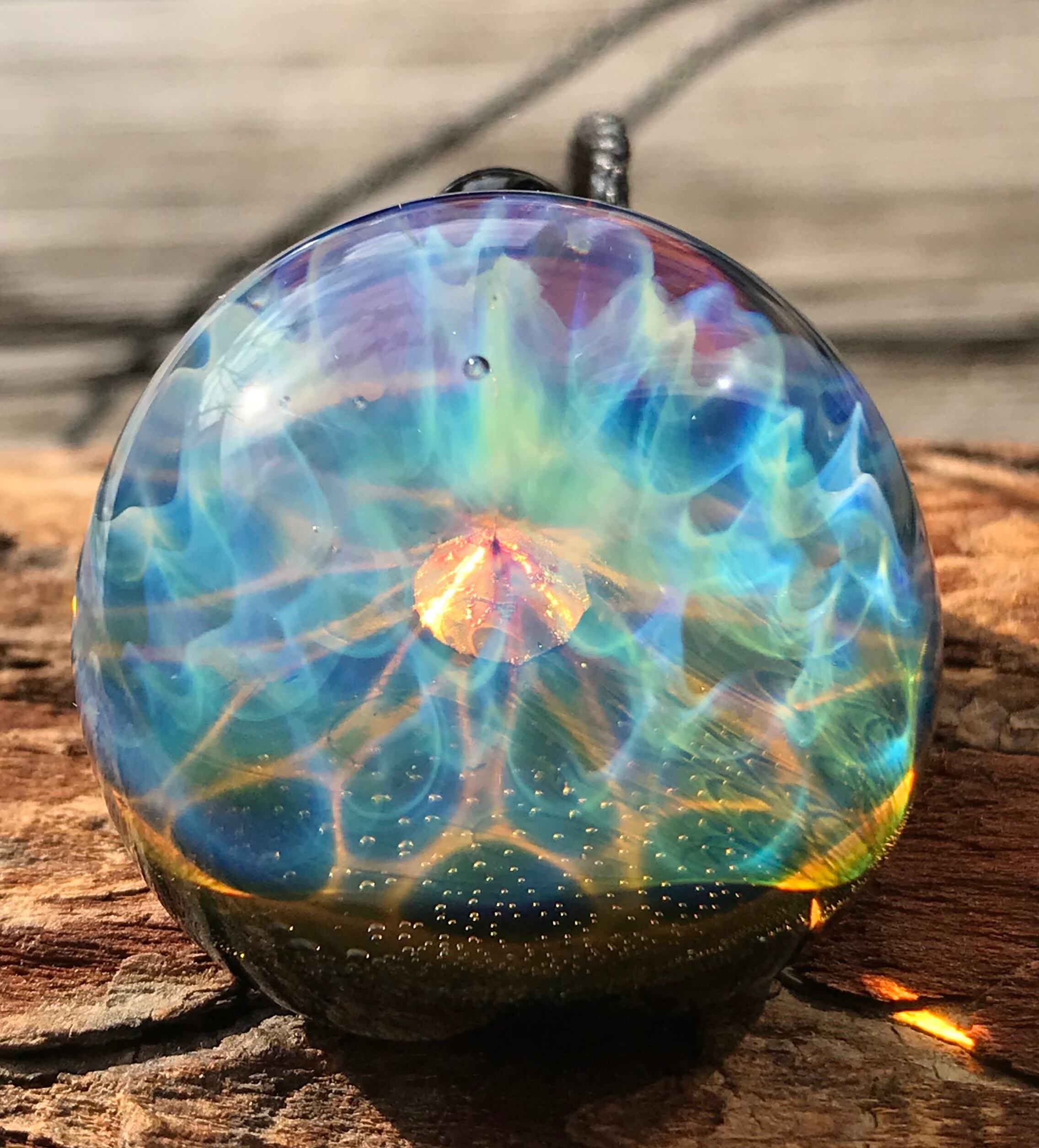 耐熱ガラスのボロシリケイトガラスを素材に、金と銀を使用して表現したガラス内全体に広がる幻想的な色合いの幾何学模様が特徴的なハンドメイドガラスペンダントです。