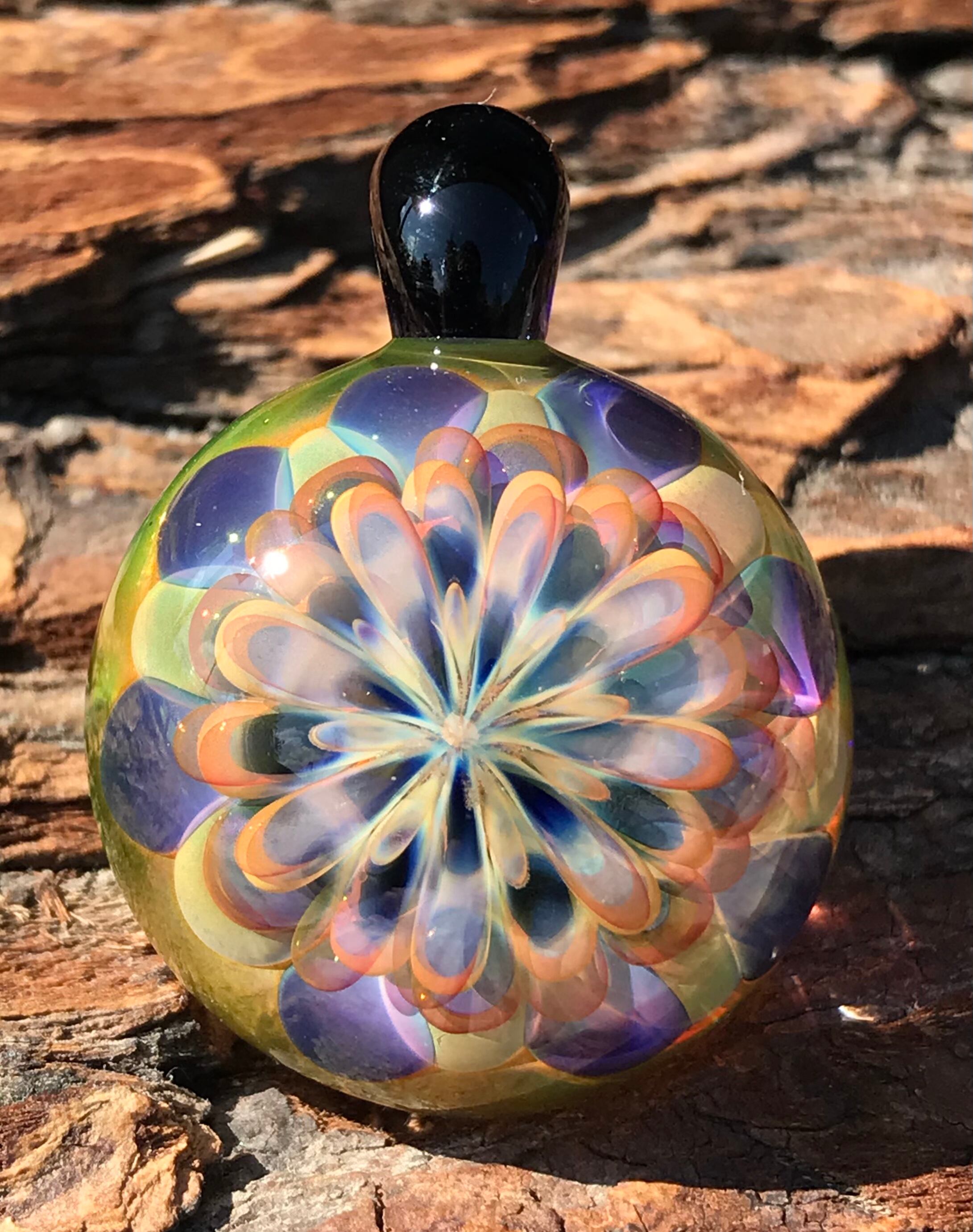 酸素を使用した酸素バーナーを使用して2000度の温度で耐熱ガラスを溶かし、ハンドメイドで製作された一つだけのガラスペンダントです。