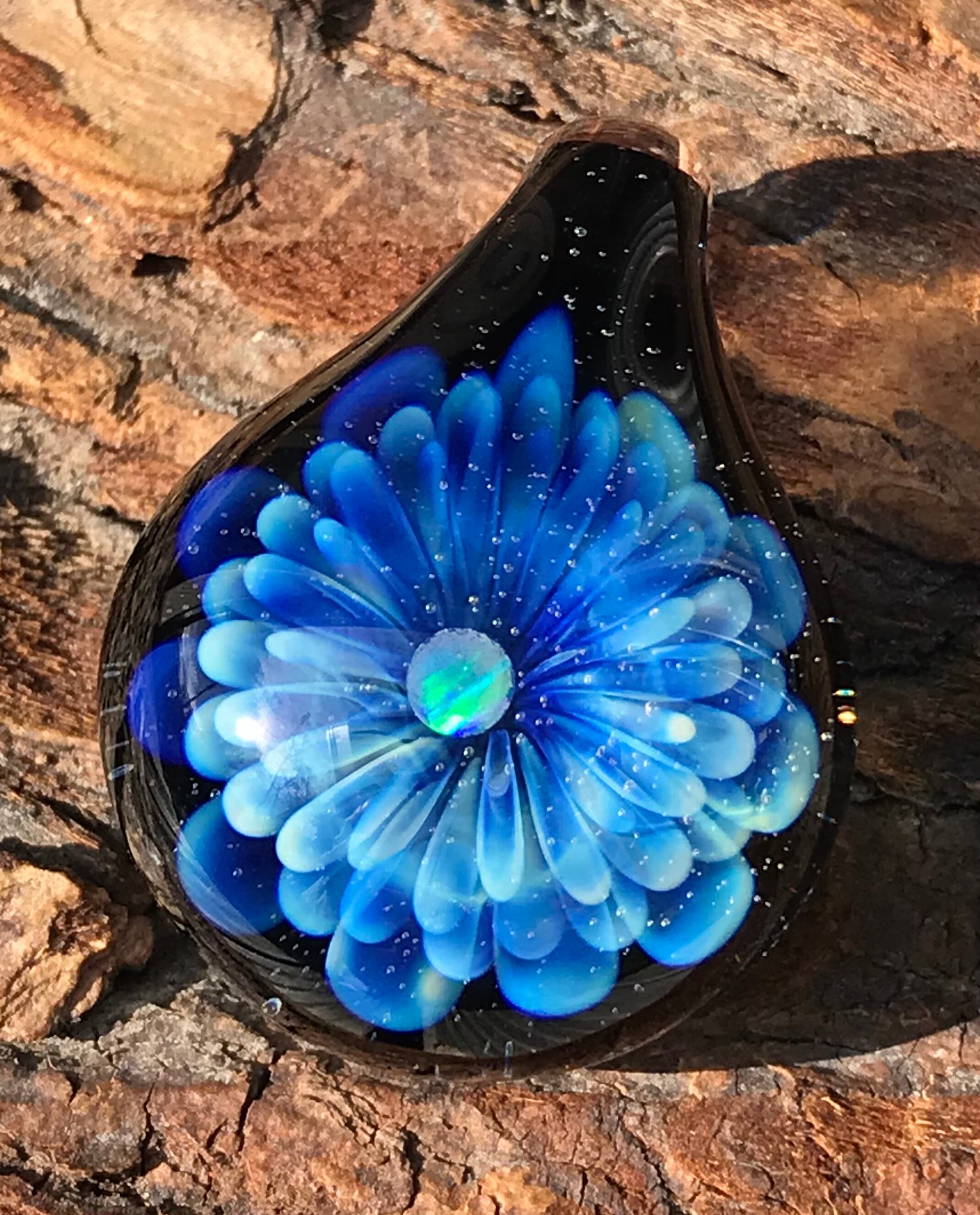 ブルーの立体の幾何学的な模様に球体のオパールを添えた、ボロシリケイトガラスのハンドメイドペンダントです。