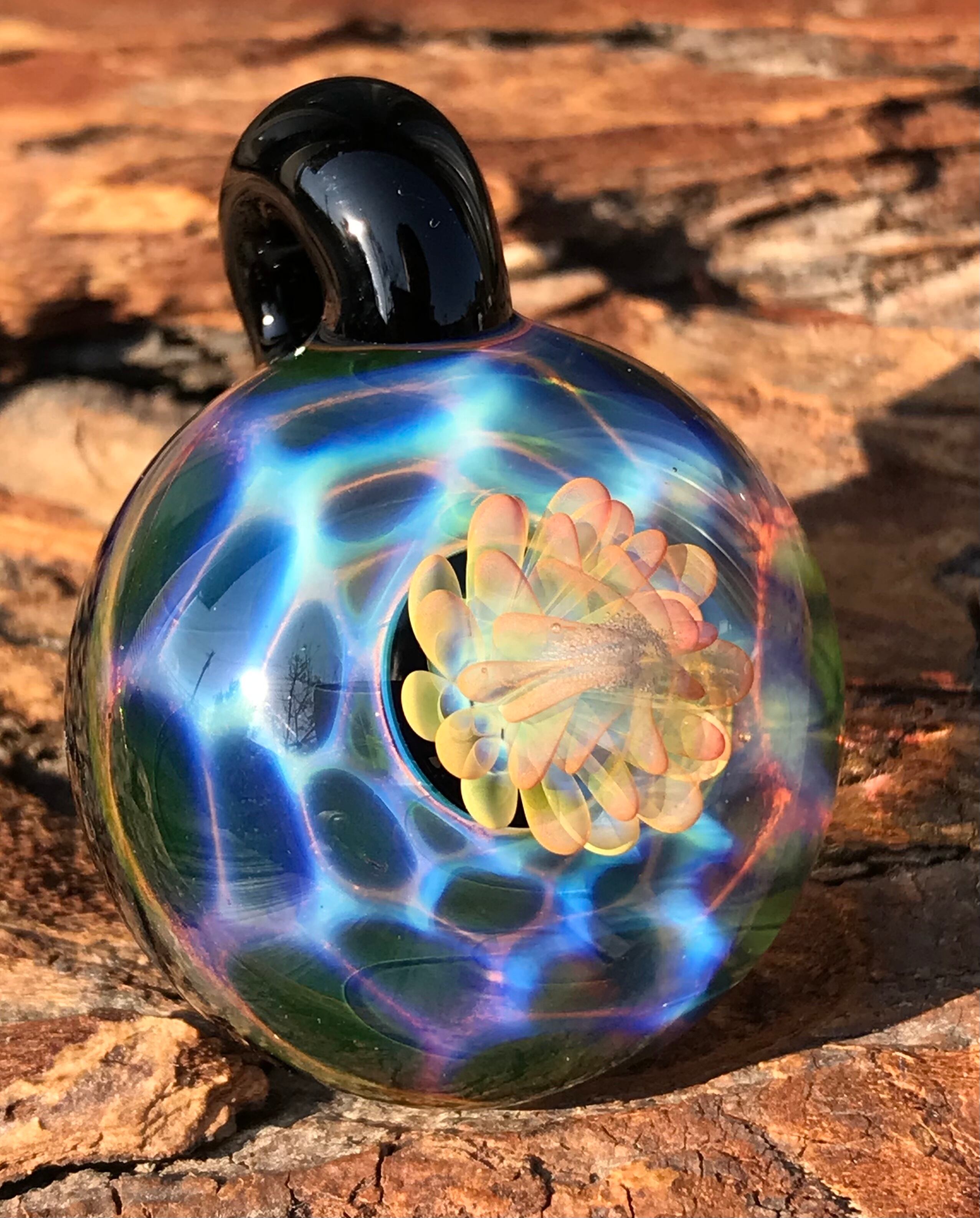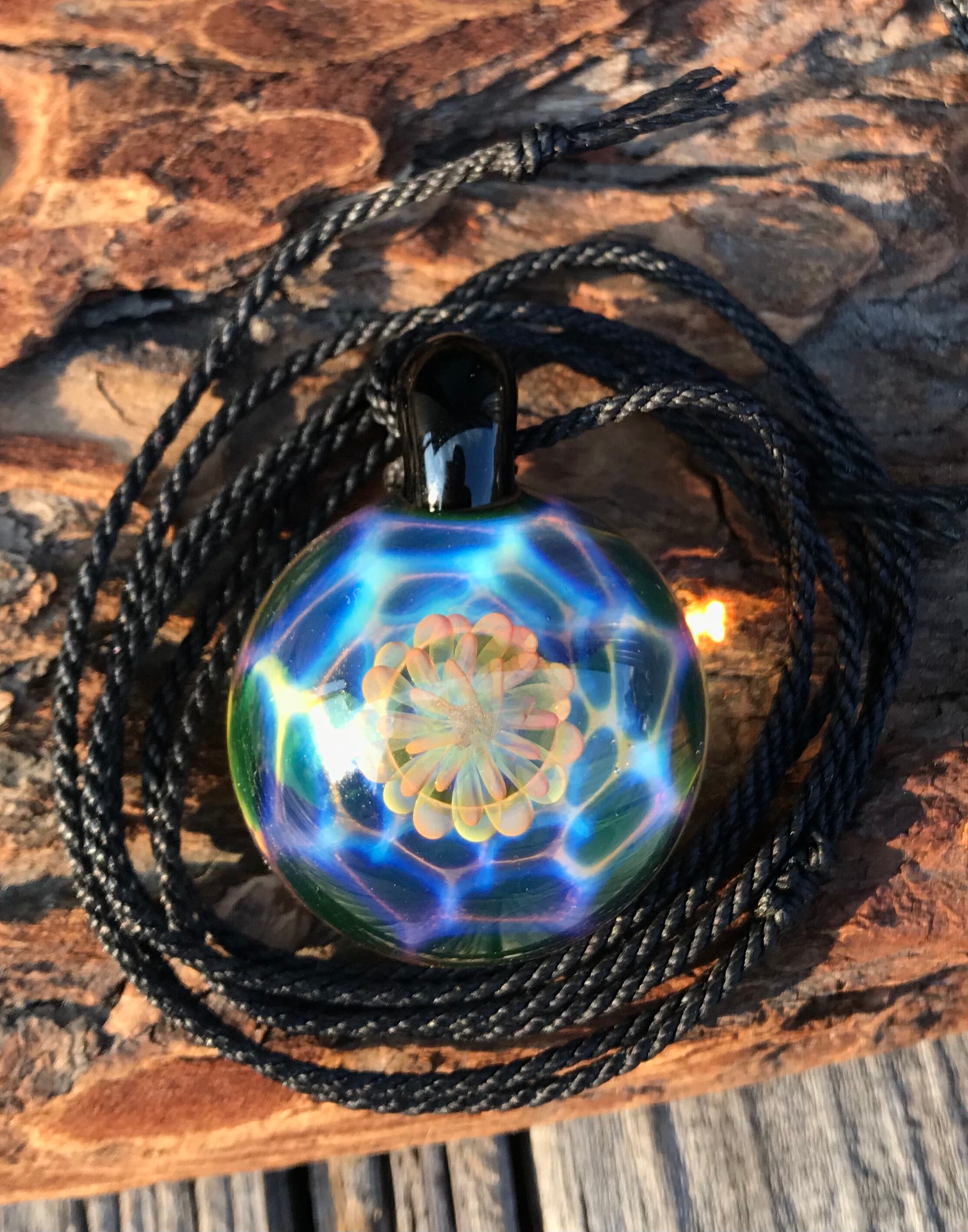 酸素を使用した酸素バーナーで2000度以上の温度で耐熱ガラスを溶かし、手作業で製作された一つだけのガラスペンダントです。