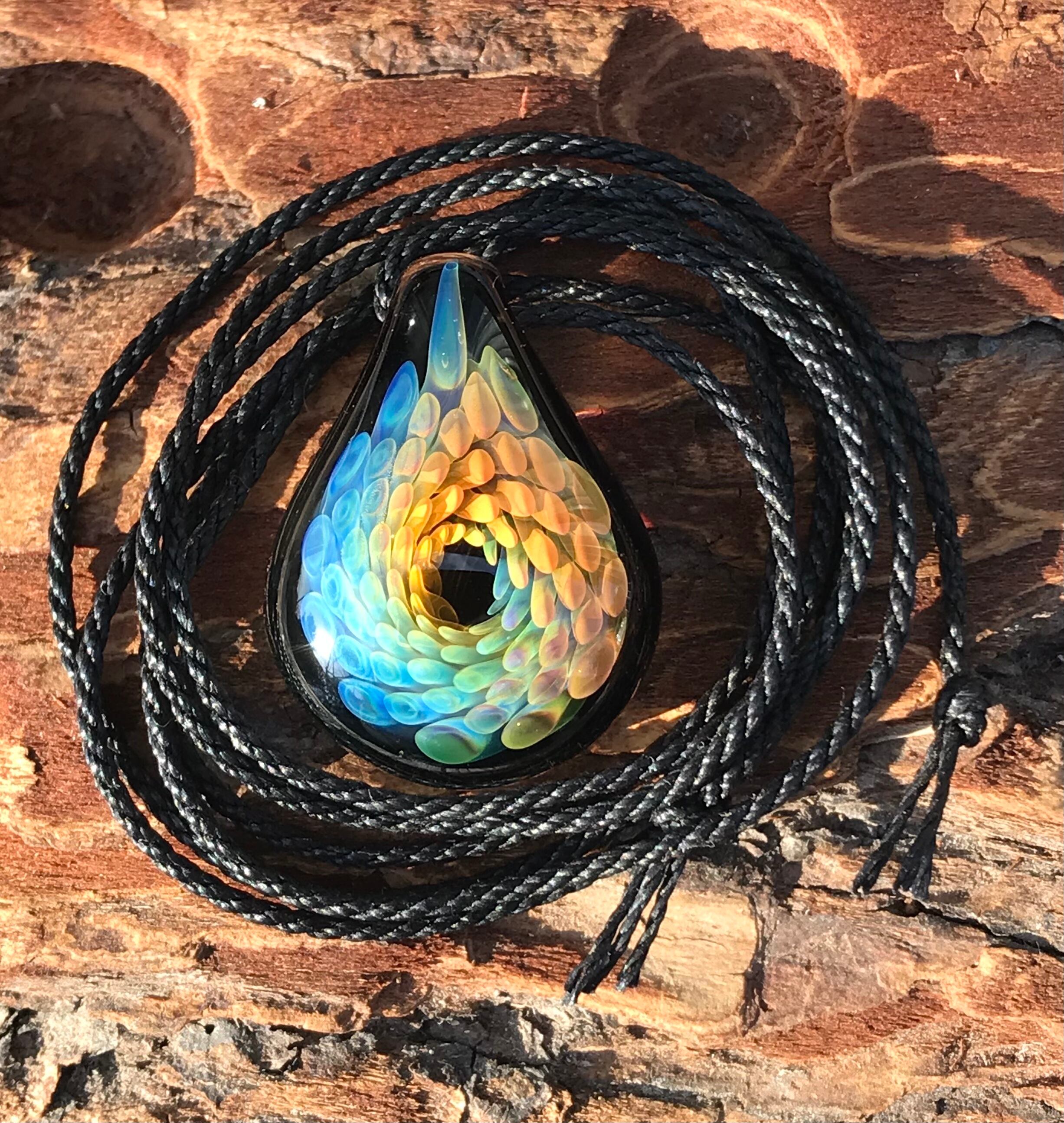 ペンダントの紐は作品画像と同じ状態でお届けします。(黒色のワックスコードのみつより紐です)