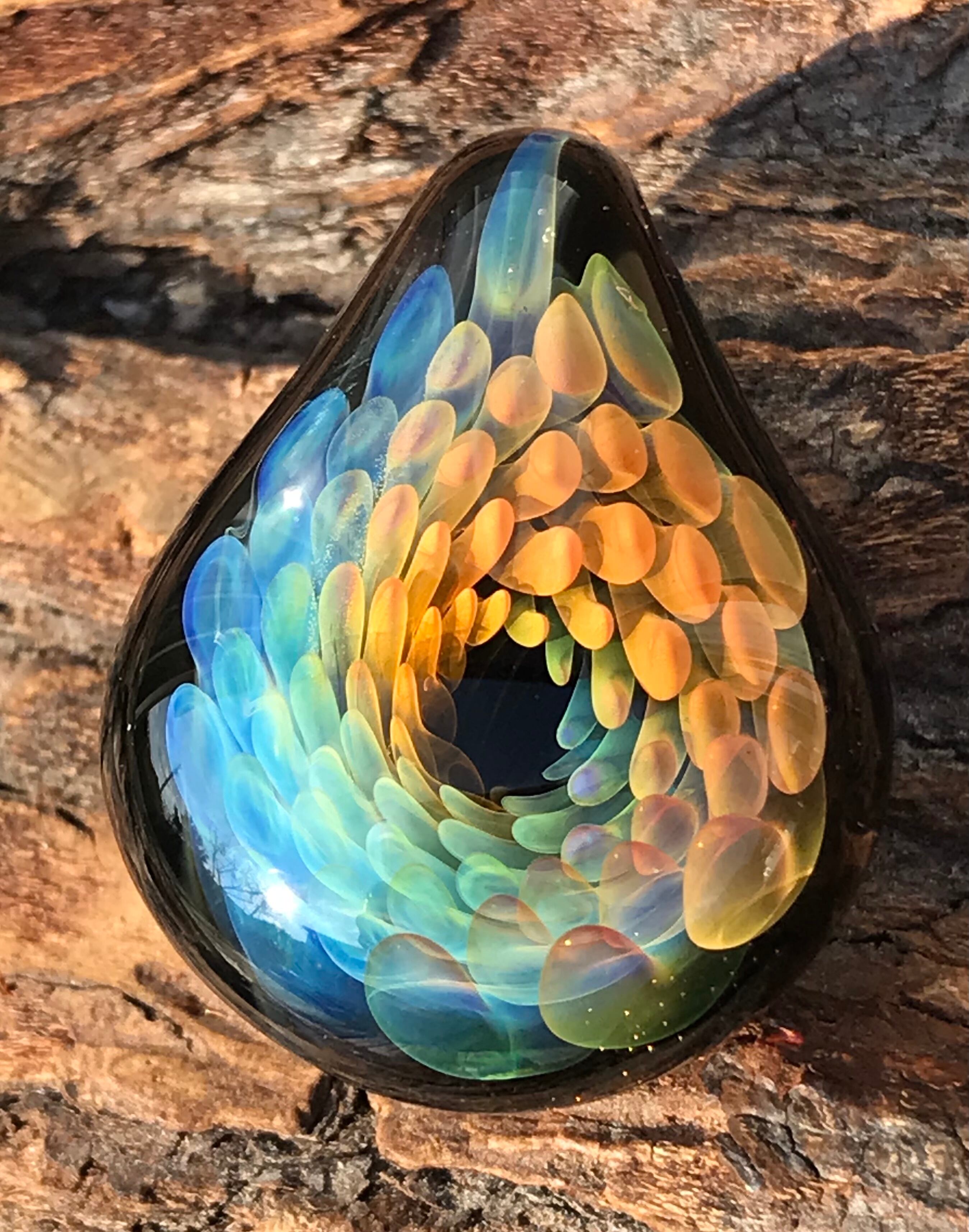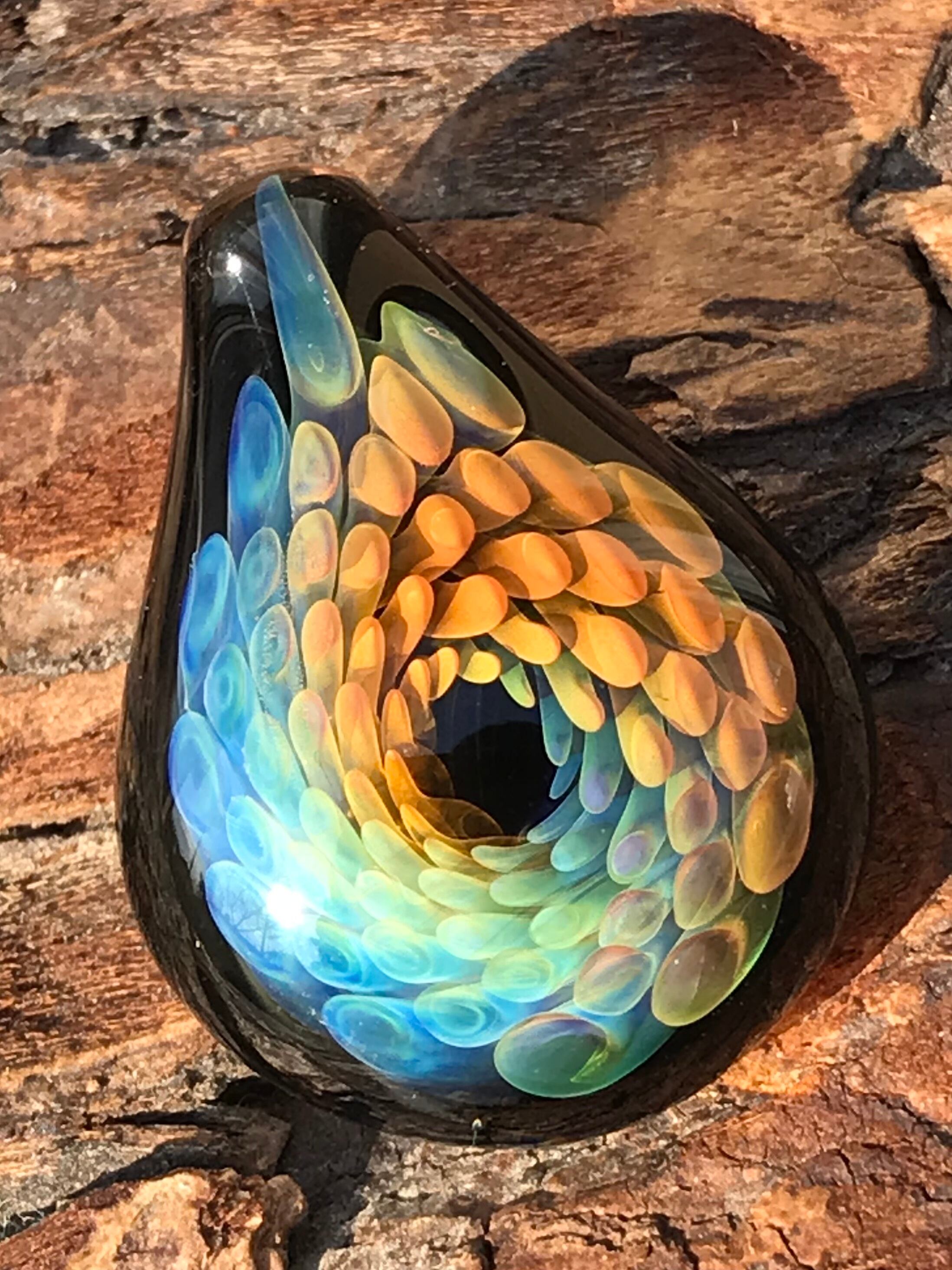 酸素を使用した酸素バーナーで2500度以上の温度で耐熱ガラスを溶かし、手作業で製作された一つだけのガラスペンダントです。