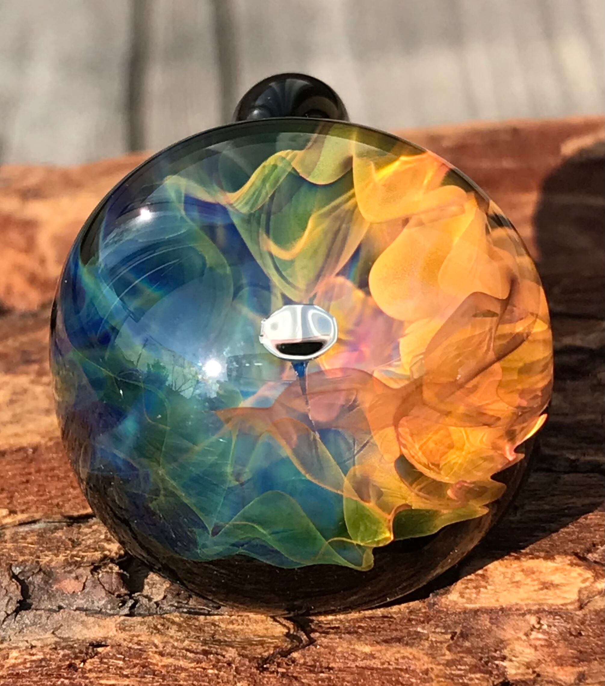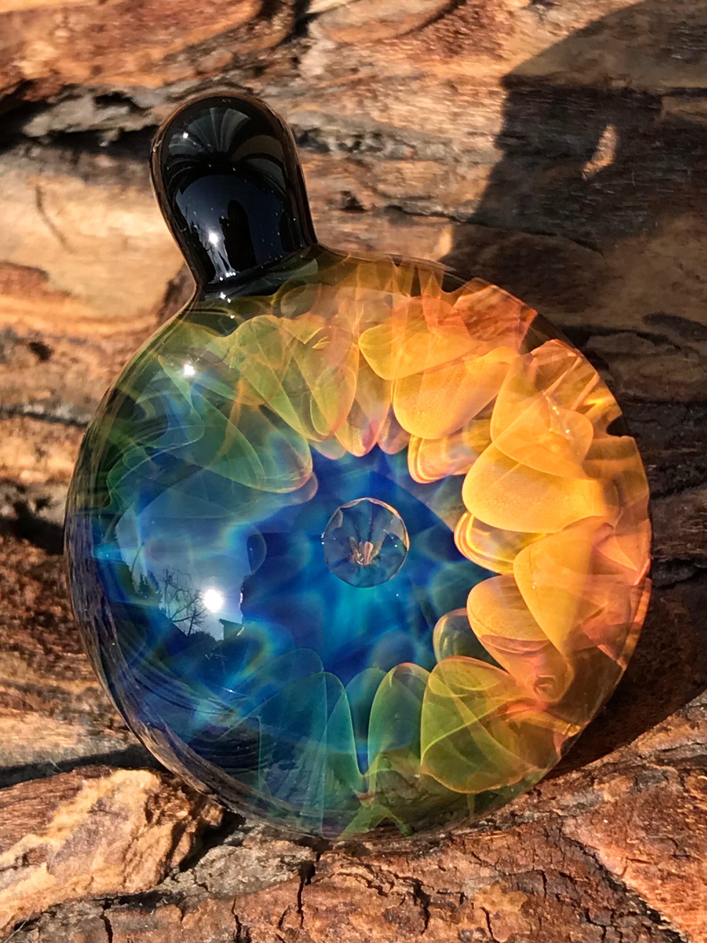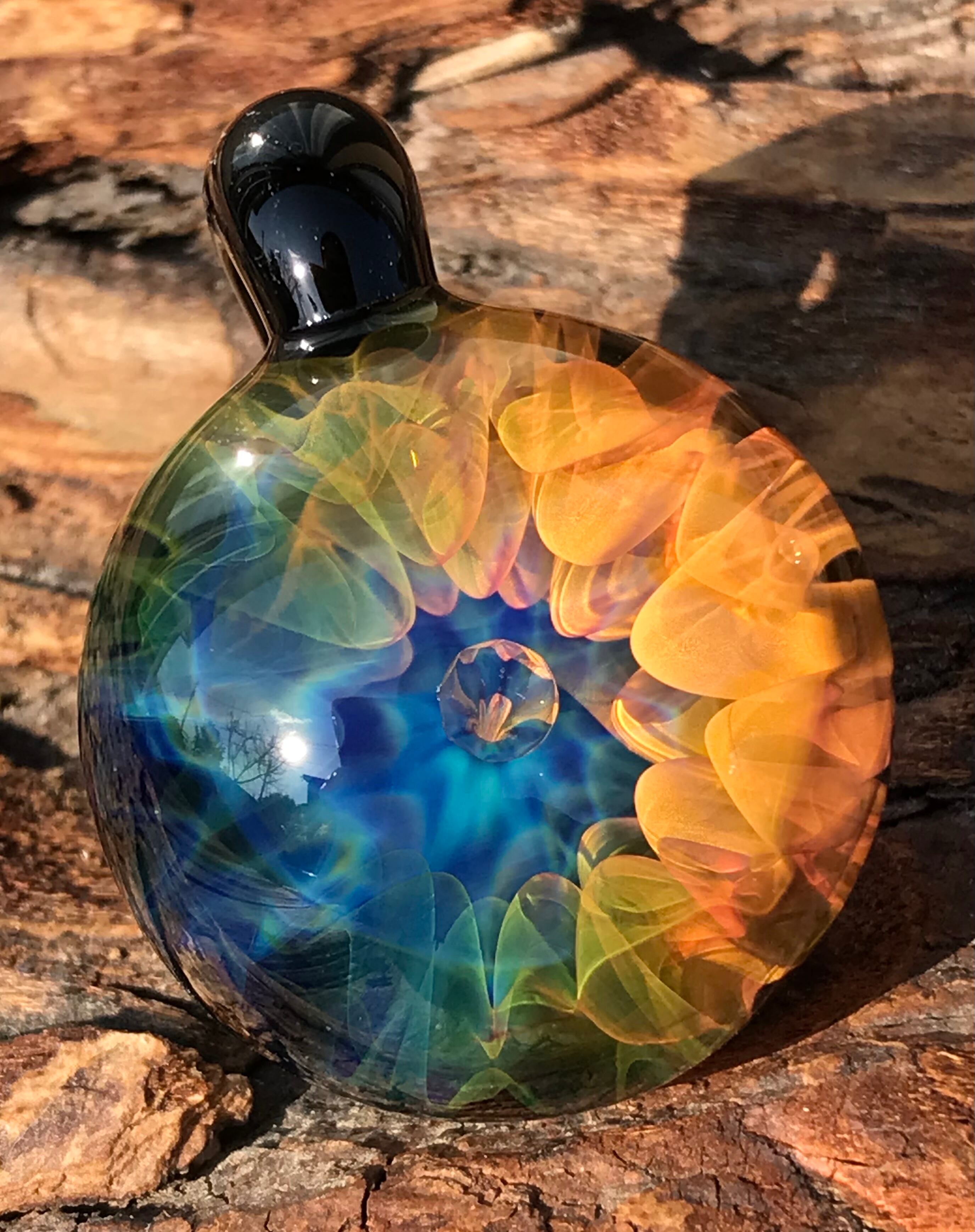酸素を使用した酸素バーナーで2500度以上の温度で耐熱ガラスを溶かし、手作業で製作された一つだけのガラスペンダントです。