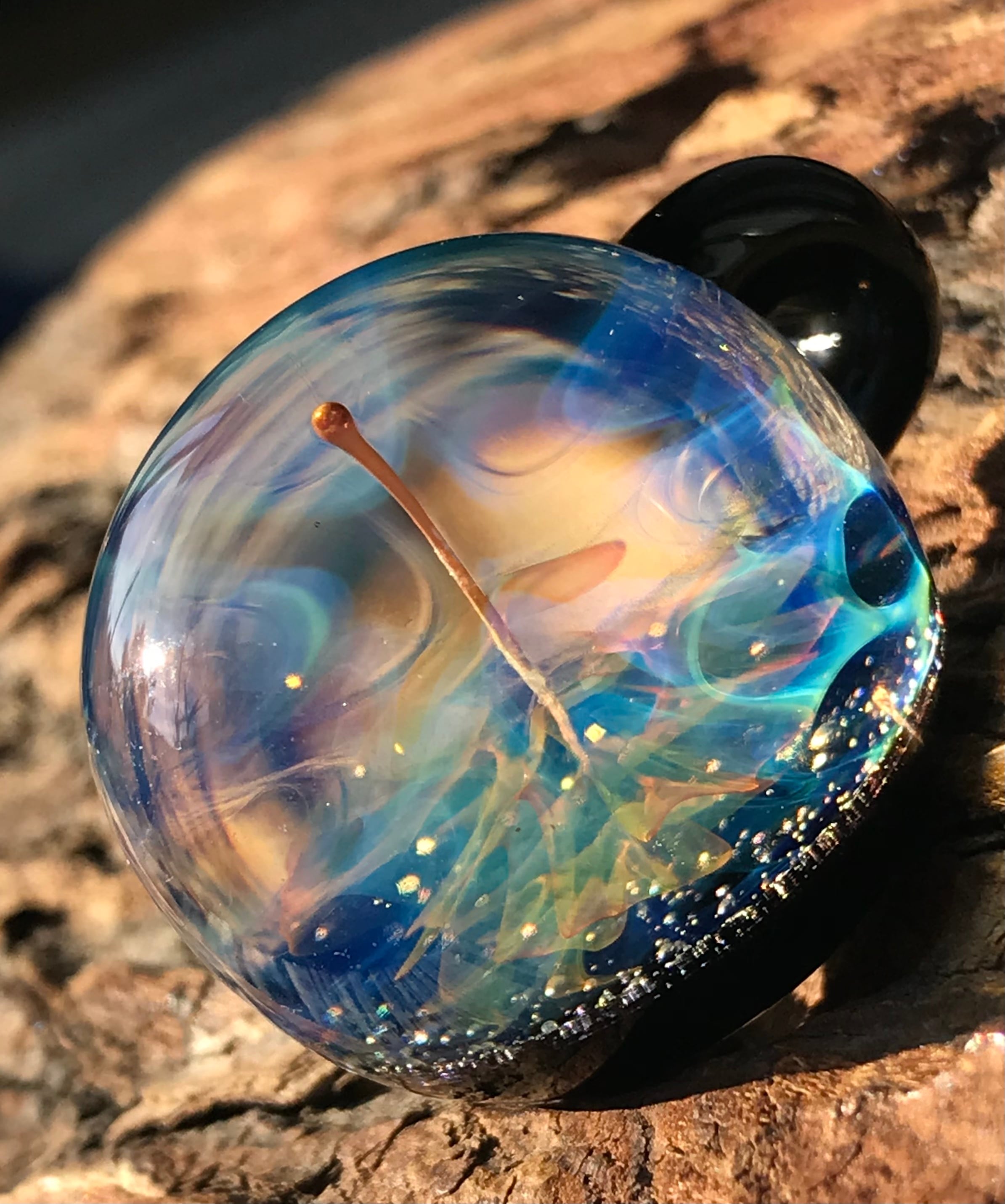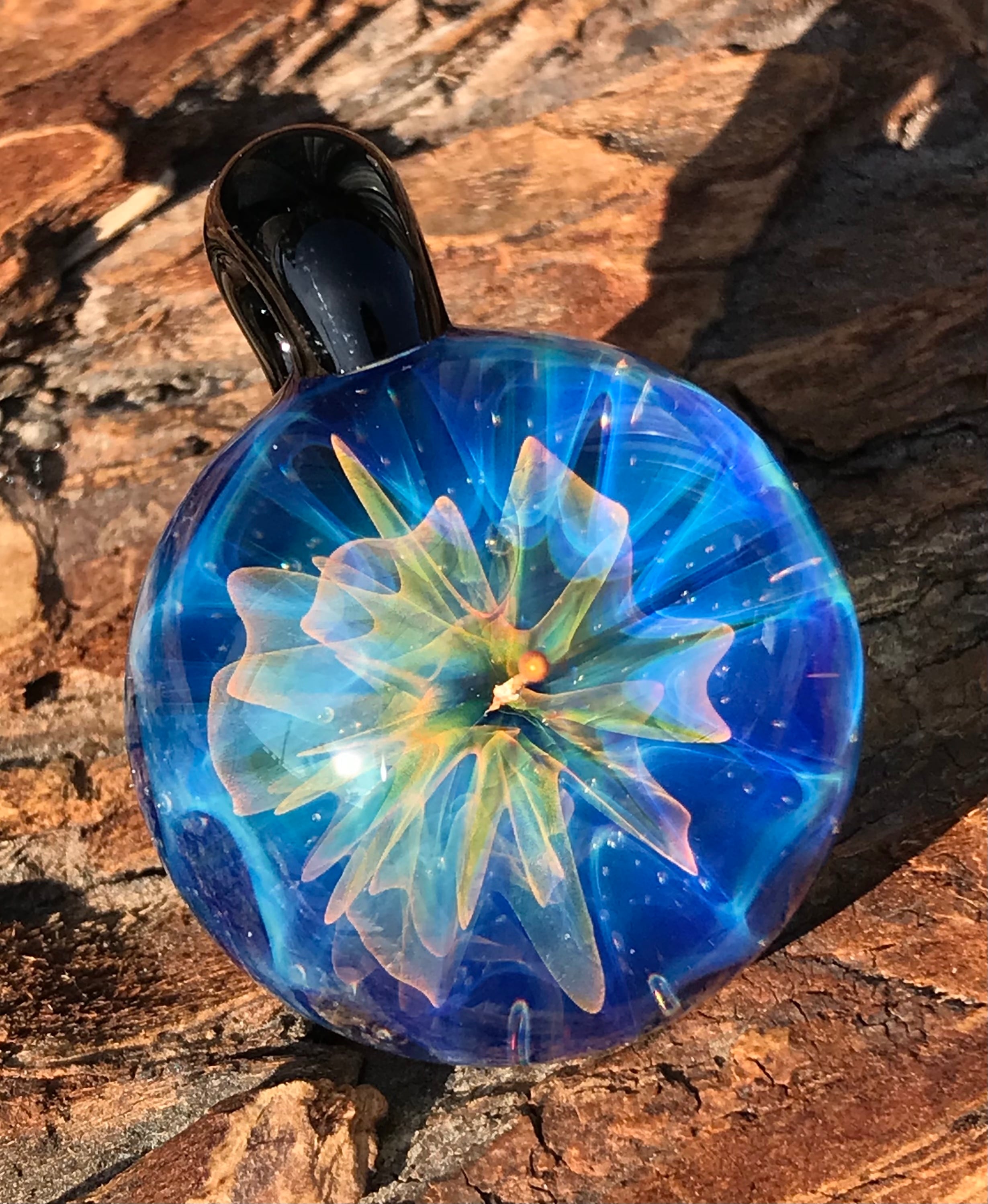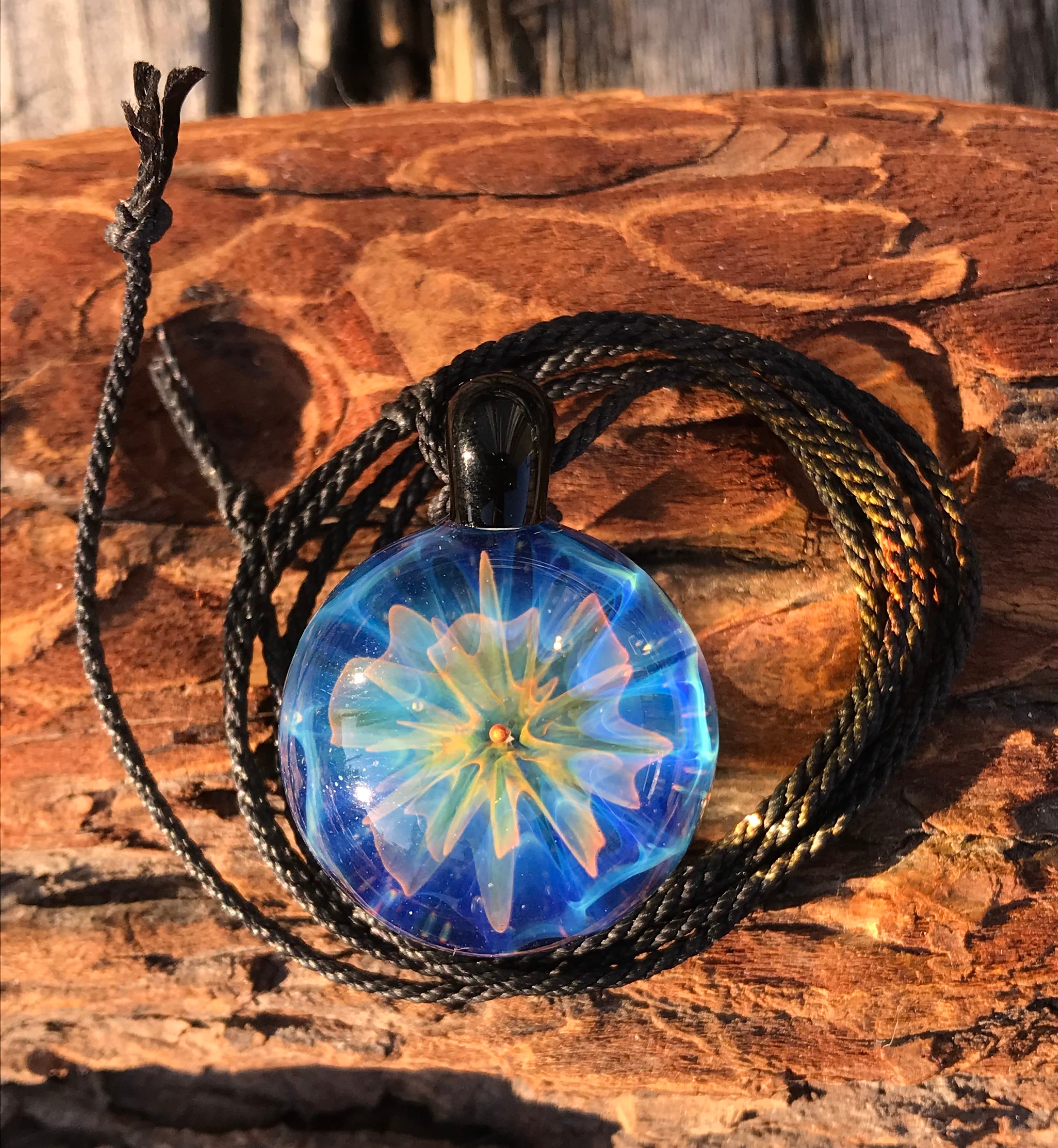 酸素を使用した酸素バーナーで2500度以上の温度で耐熱ガラスを溶かし、手作業で製作された一つだけのガラスペンダントです。