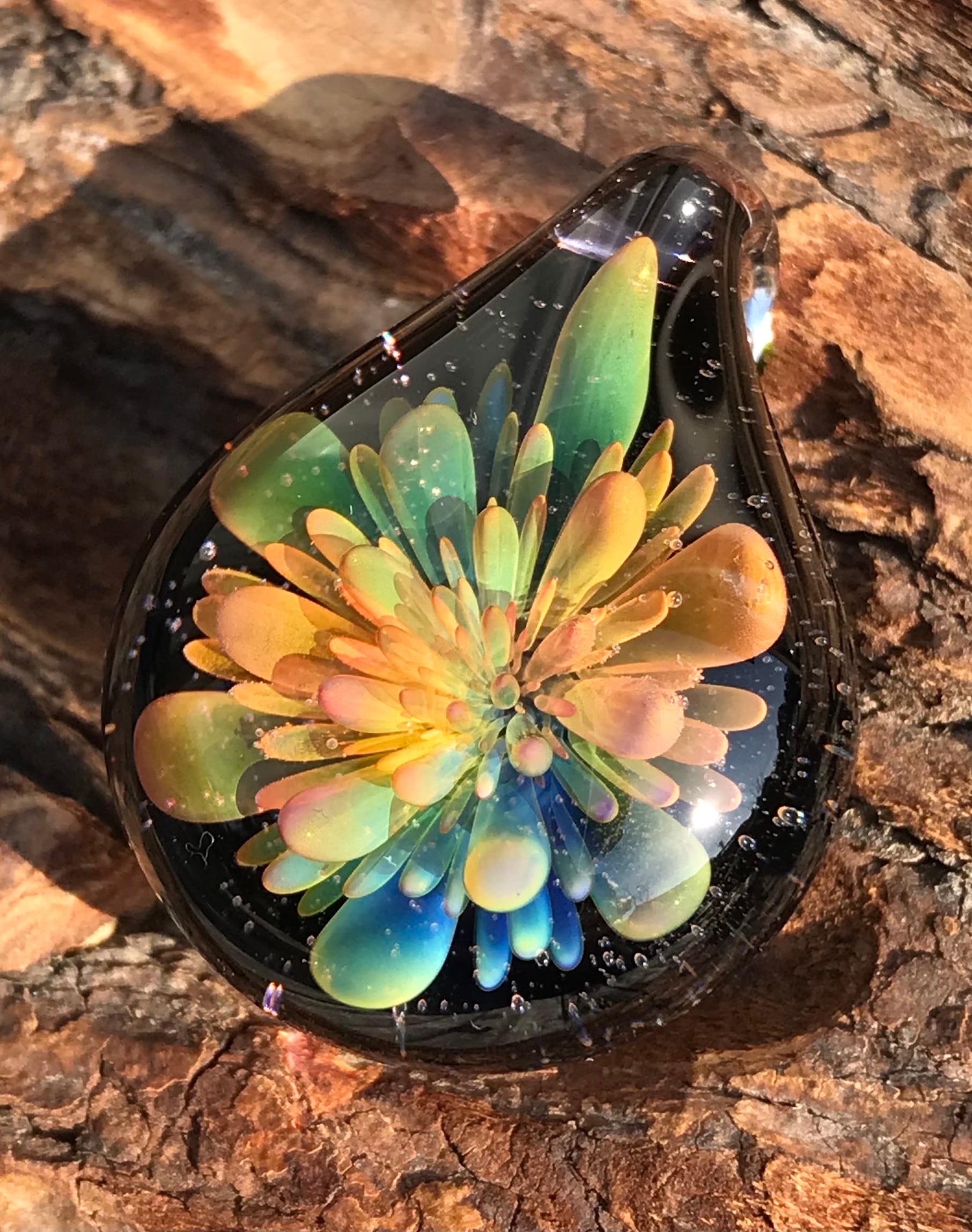 酸素を使用した酸素バーナーで2500度以上の温度で耐熱ガラスを溶かし、手作業で製作された一つだけのガラスペンダントです。
