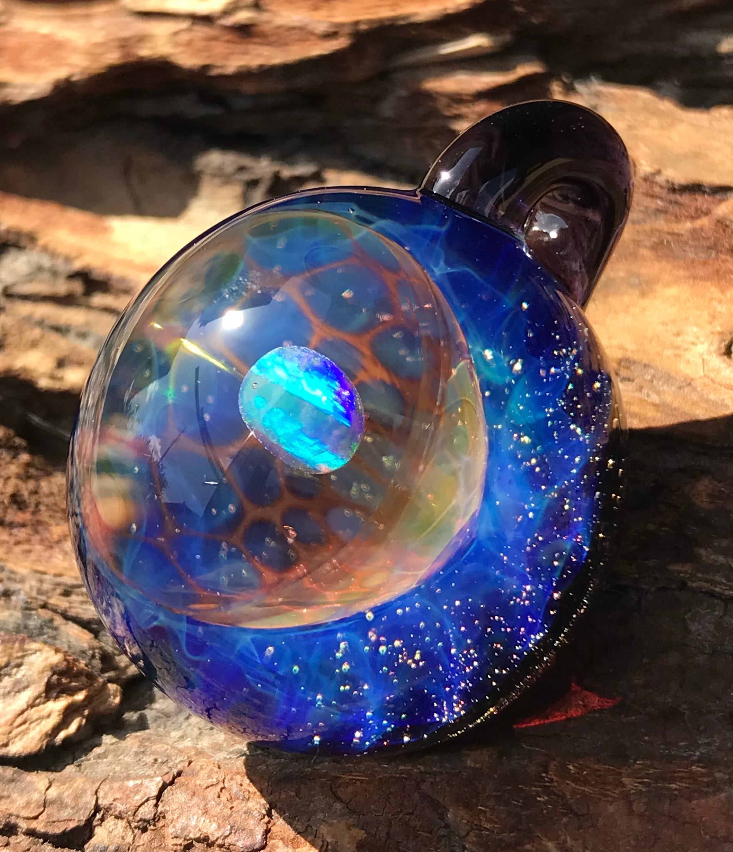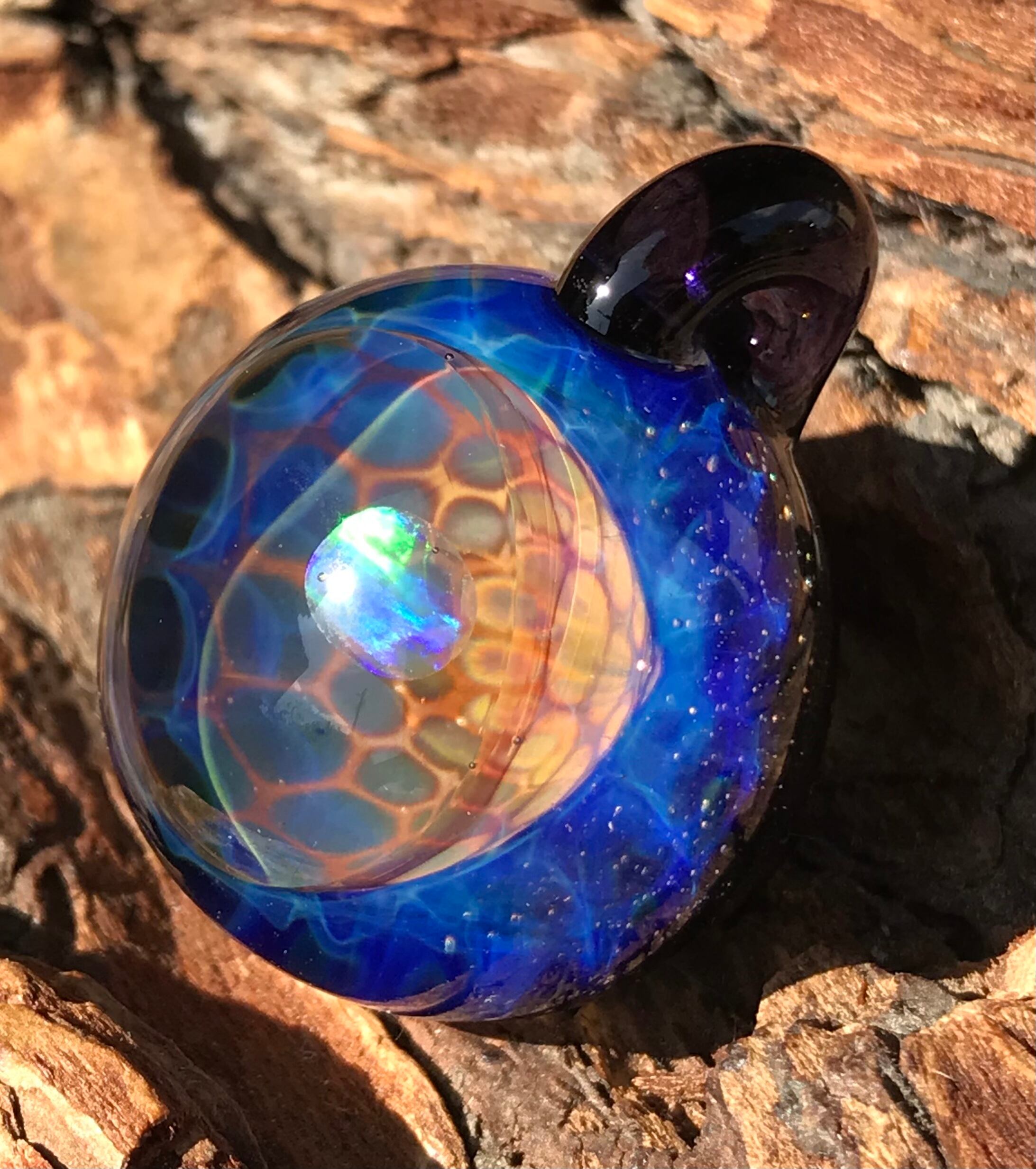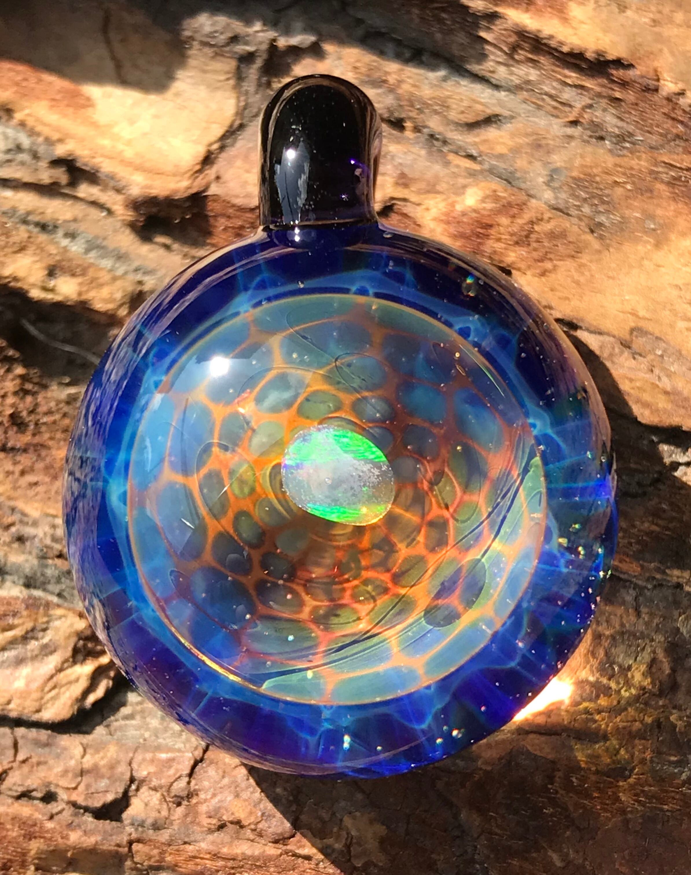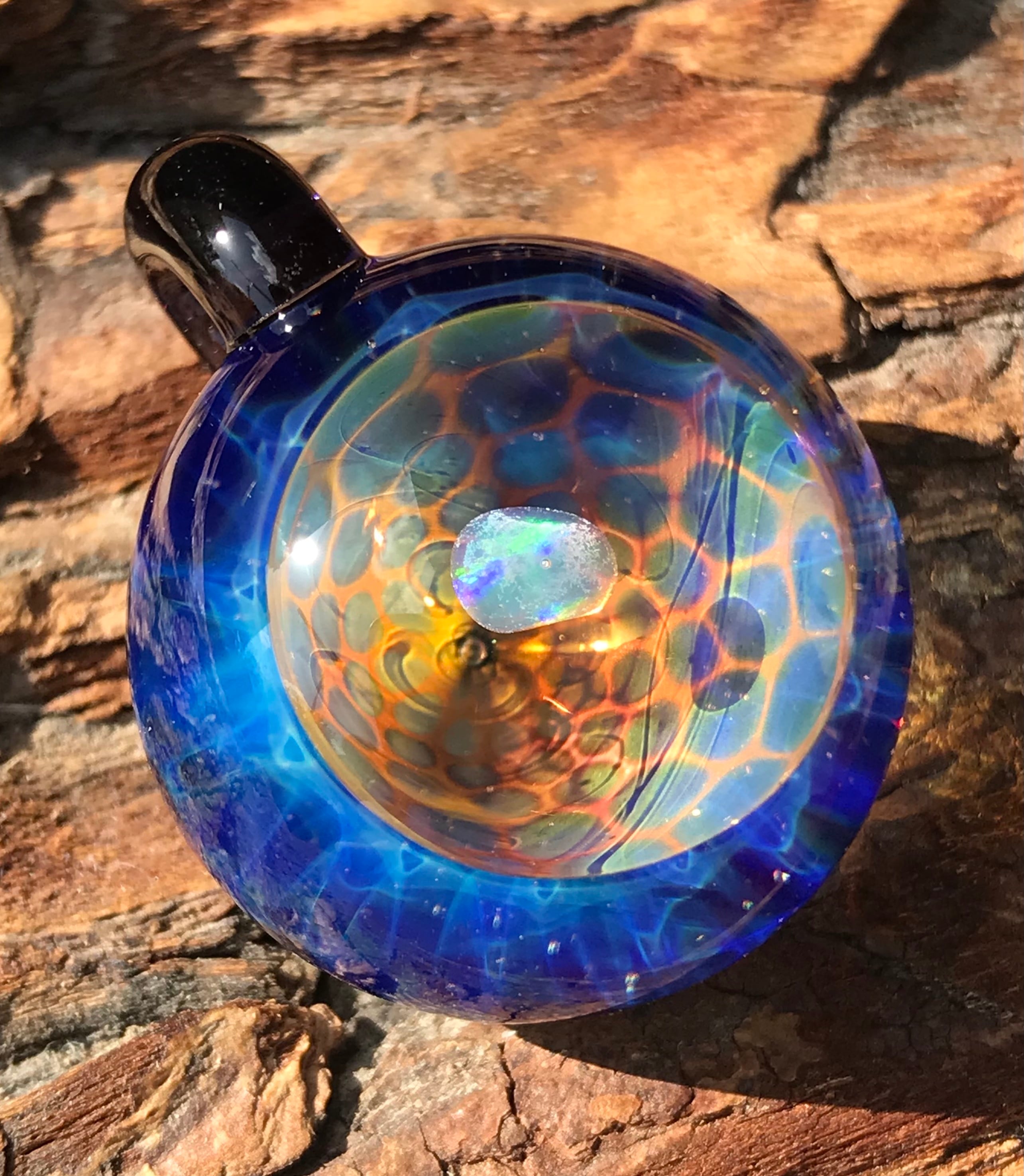 深く青い色合いの立体の幾何学模様の中にオパールが輝いているガラス作品です。