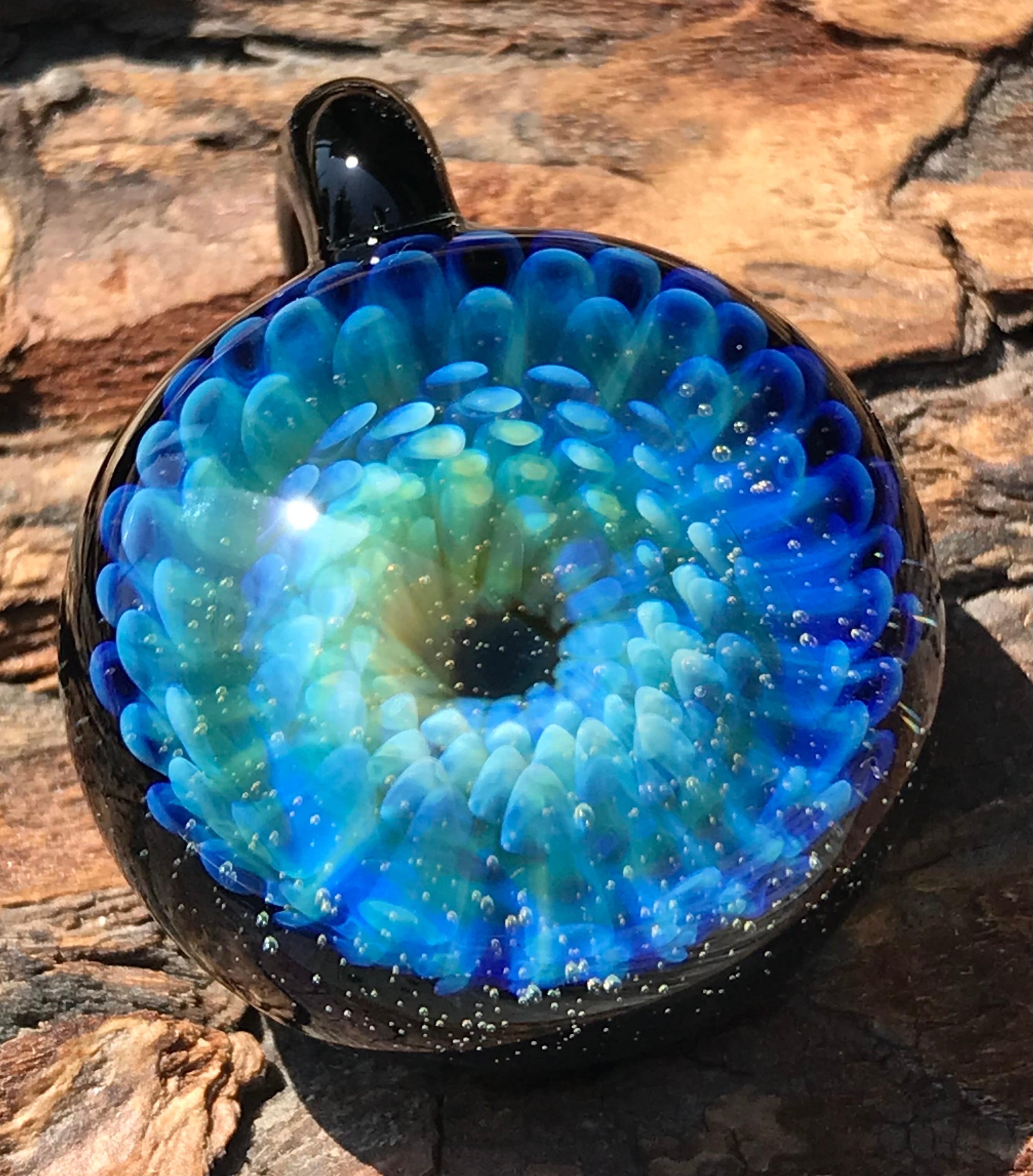 酸素を使用した酸素バーナーで2000度以上の温度で耐熱ガラスを溶かし、手作業で製作された一つだけのガラスペンダントです。